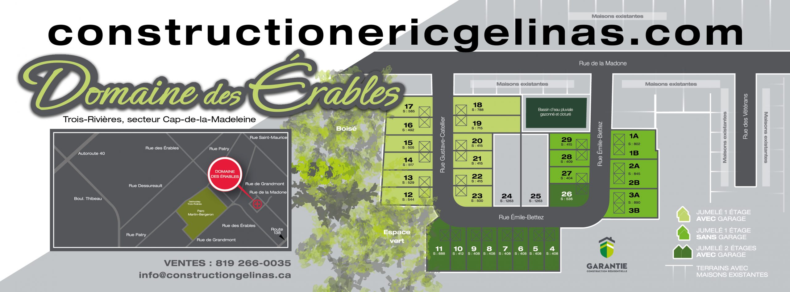 Le Domaine des Érables est un projet de développement immobilier résidentiel situé au Cap-de-la-Madeleine. Développé depuis 2023, ce secteur met de l’avant des résidences jumelées de trois types (Copenhague, Davenport et Sanford) et propose dorénavant des logements modernes et fonctionnels. Cette évolution naturelle s’inscrit dans la volonté de répondre aux besoins grandissants du marché et de proposer des milieux de vie diversifiés, durables et adaptés.