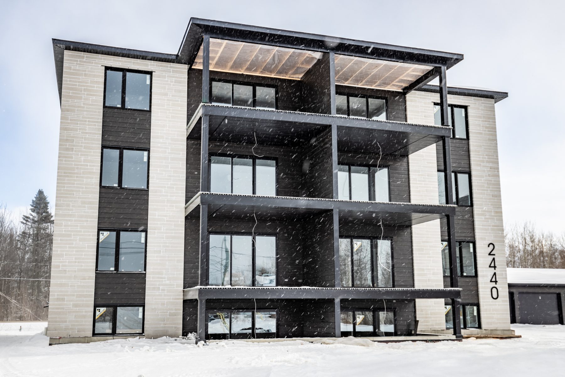 Un balcon avant et un autre arrière en aluminium. Revêtement extérieur en fibrociment et maçonnerie.