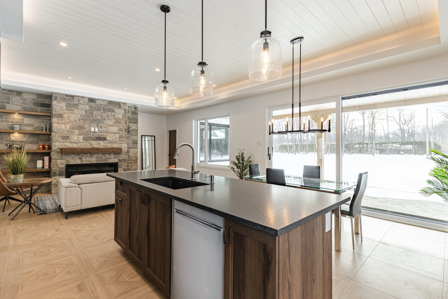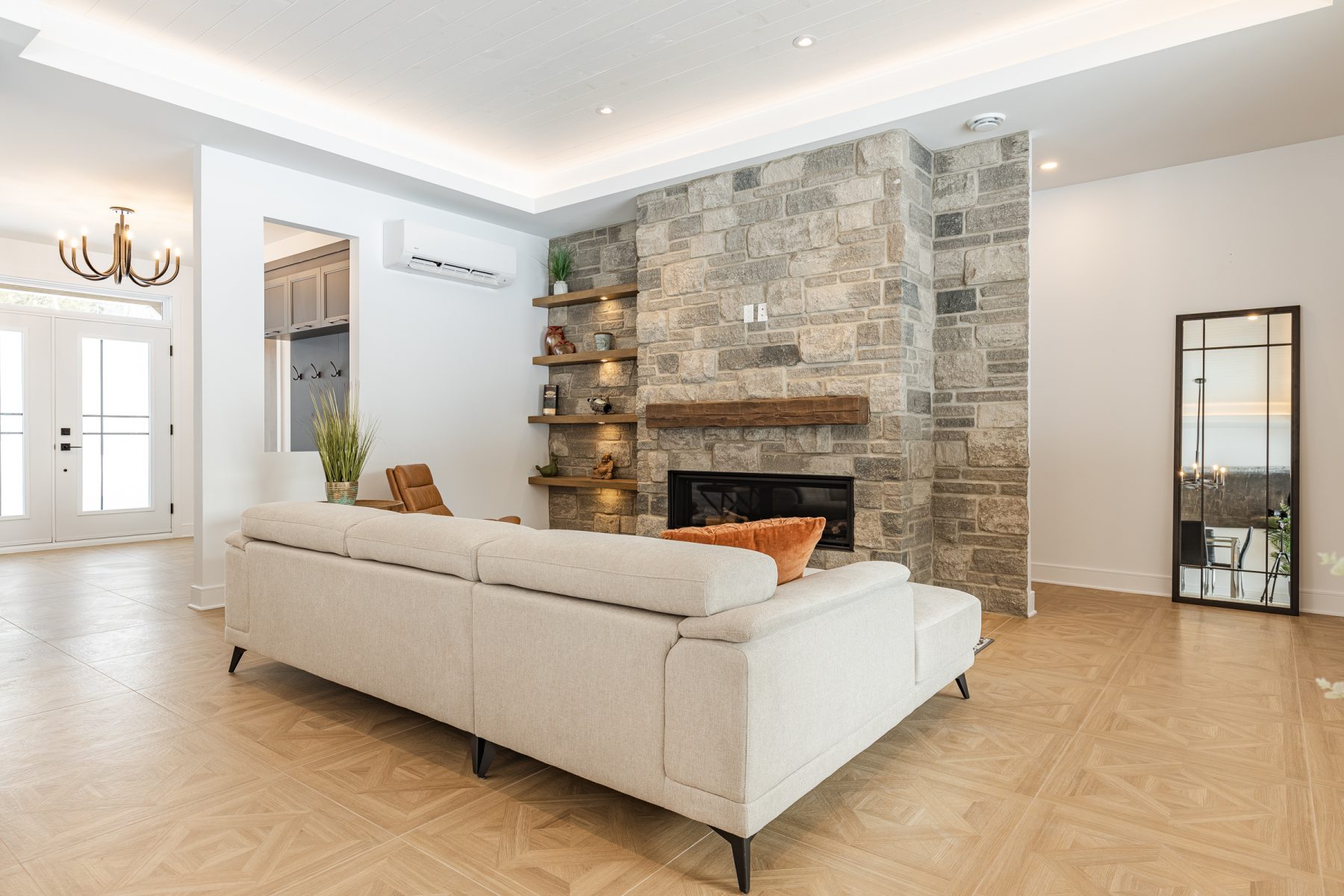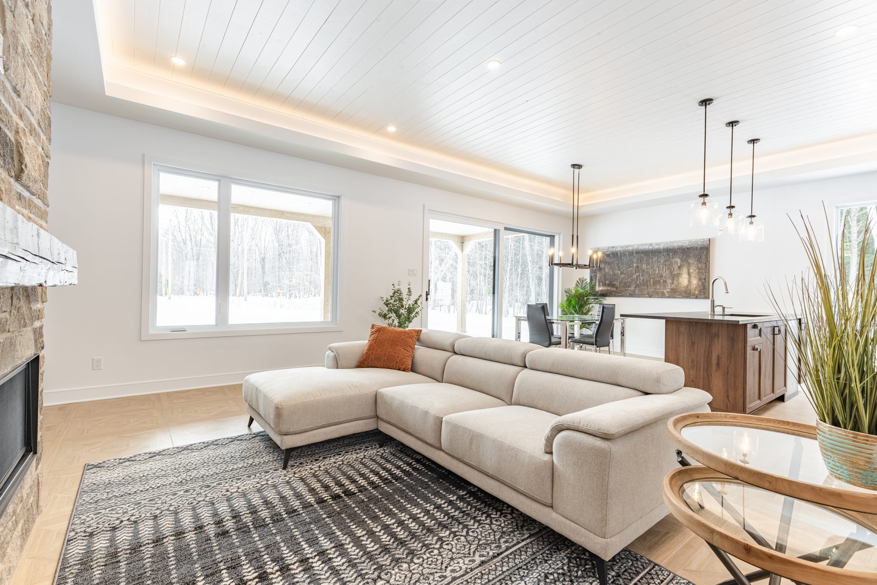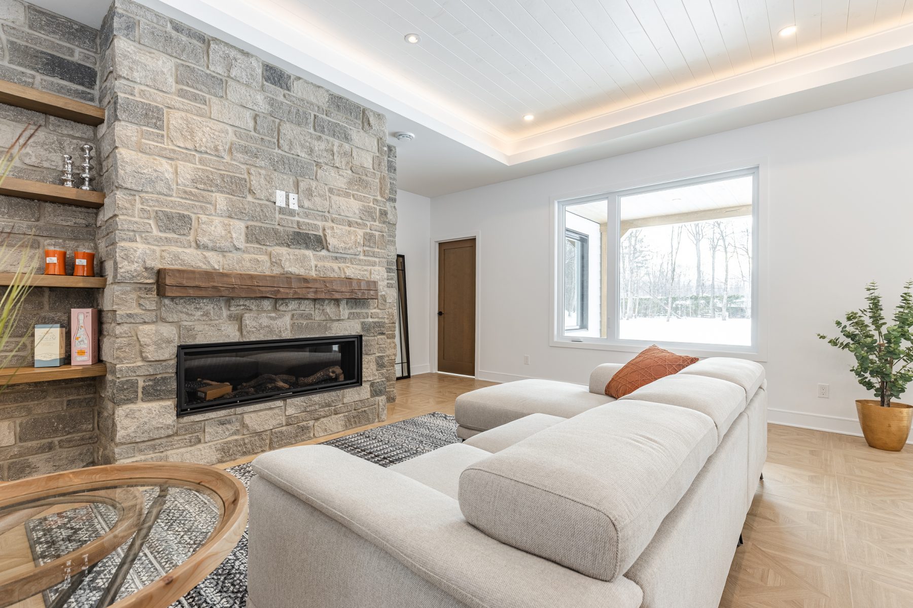 - Salon 18,6 x 13 pi avec foyer au gaz, mur de pierre et boiseries