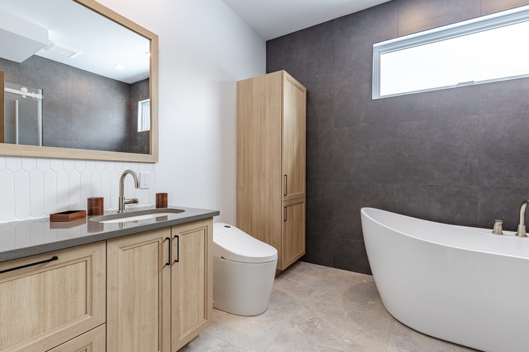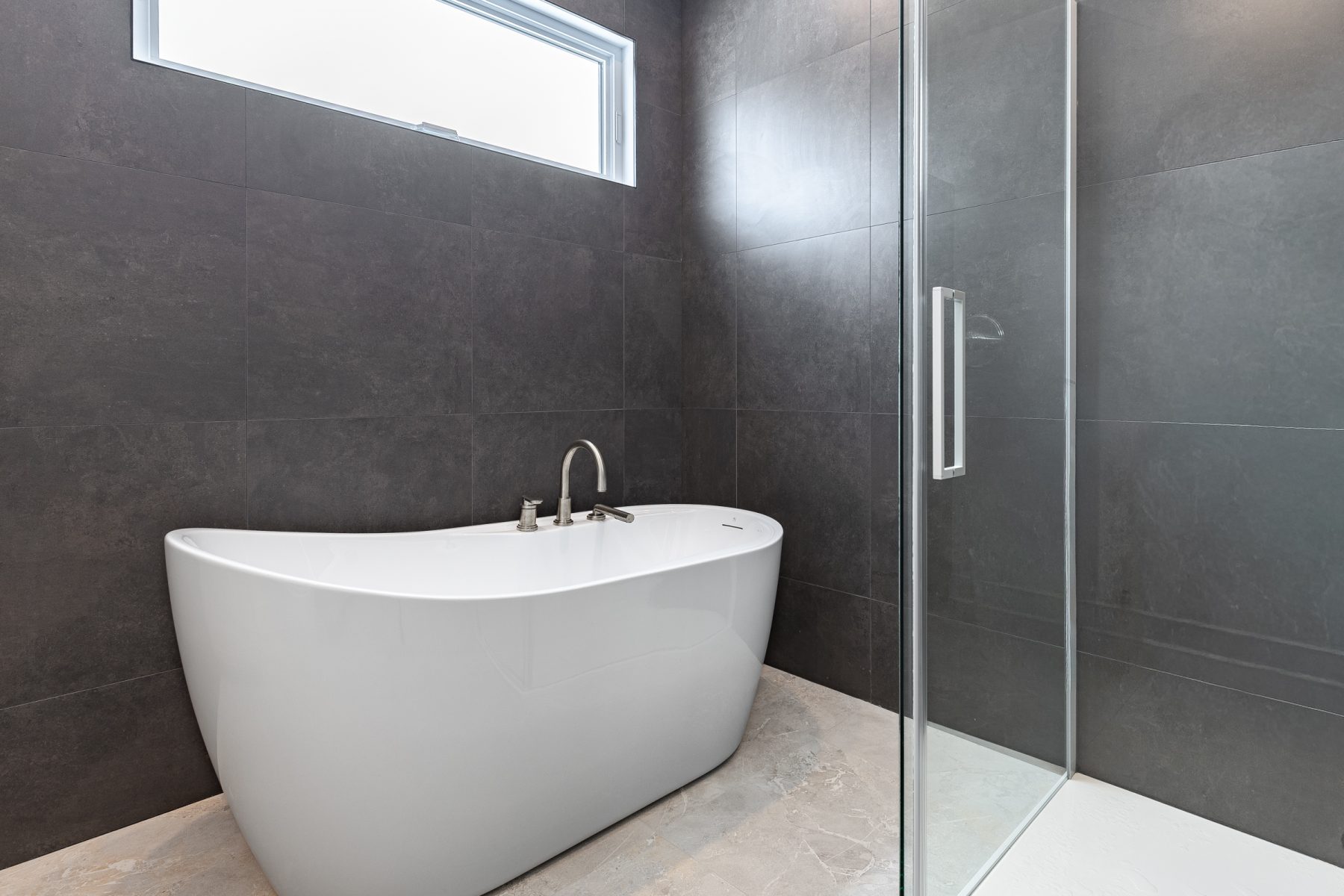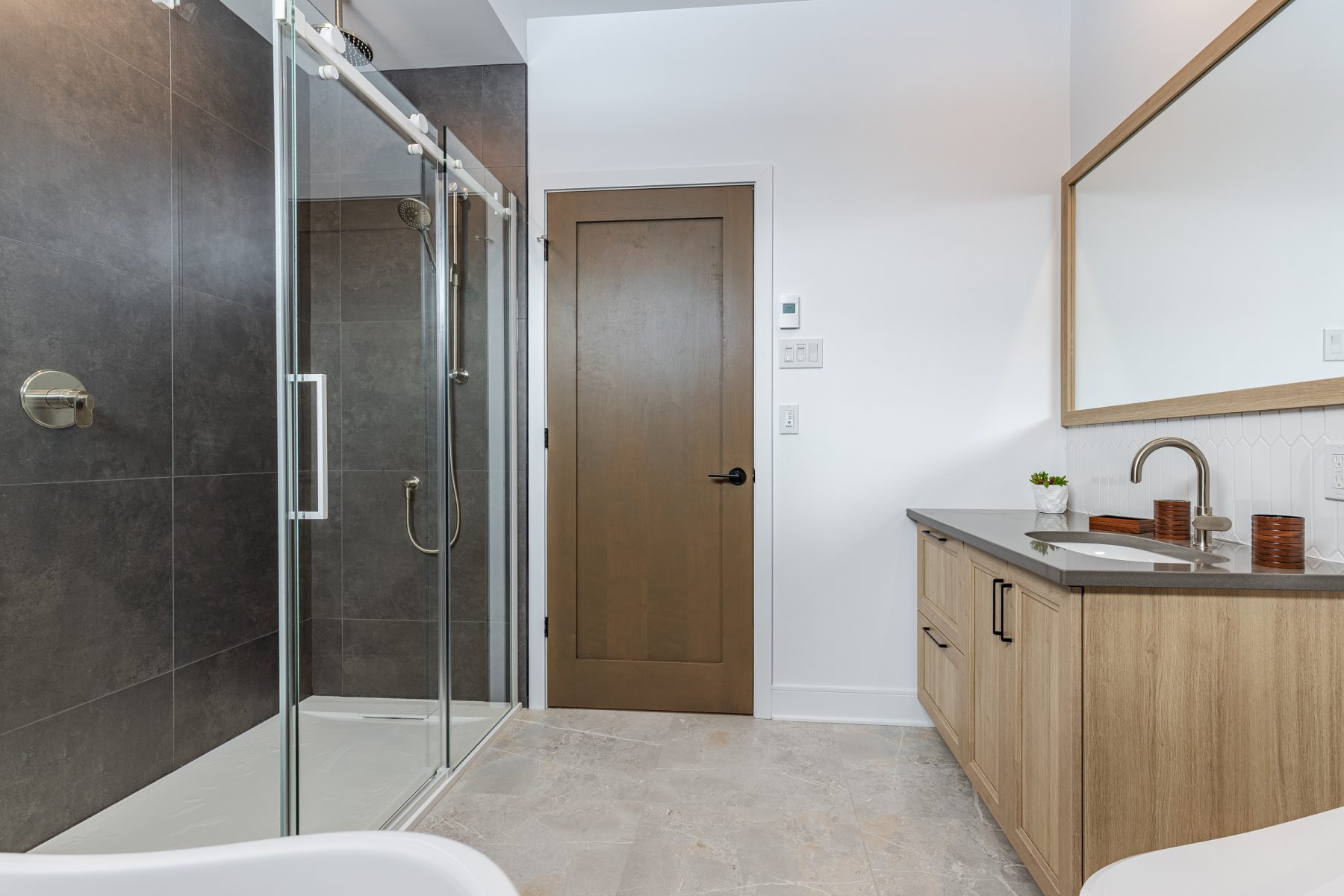 - Salle de bain principale 9 x 10 pi avec douche 3 x 4 pi, bain autoportant et céramique murale