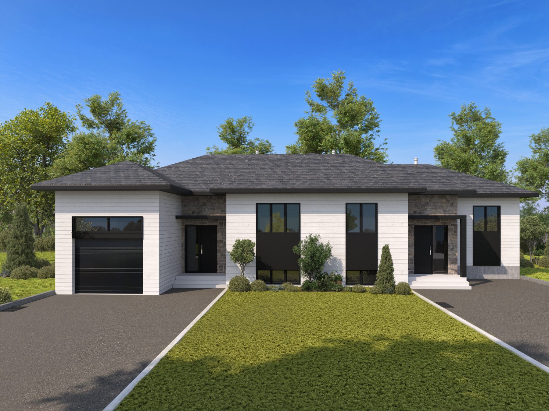 Un vrai clé en main : tourbe avant, entrée double, luminaires, garage et même l’adresse civique. Ne reste que le gazon arrière à semer et arroser.